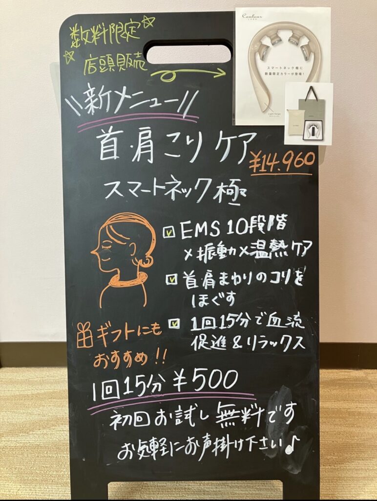 こんばんは🌃さとみです。 朝晩だいぶ風が涼しく過ごしやすくなってきましたね🍂 今日は🆕オプションメニューのご紹介です!首肩凝りが気になる方におすすめ♪ 【スマートネック極】首を鍛えてほぐして温めるマシーンです😊 EM... -
